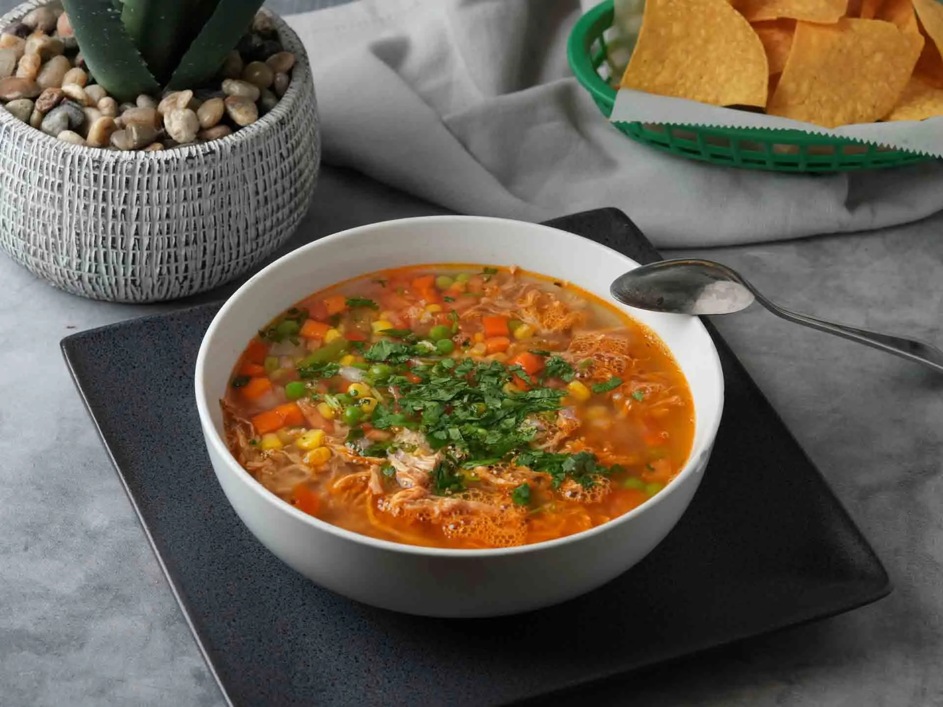 Chicken broth with rice and chicken chunks, pico de gallo, fried tortilla strips and shredded cheese.