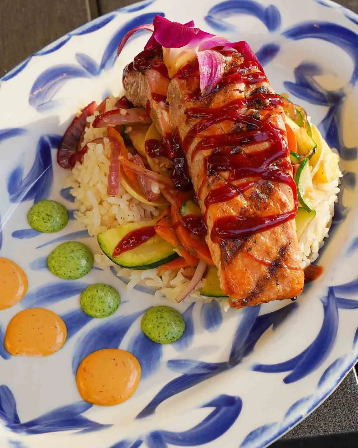 Grilled salmon served on a bed of cilantro rice, mix grilled veggies. Topped with aioli glaze, and chipotle sauce.