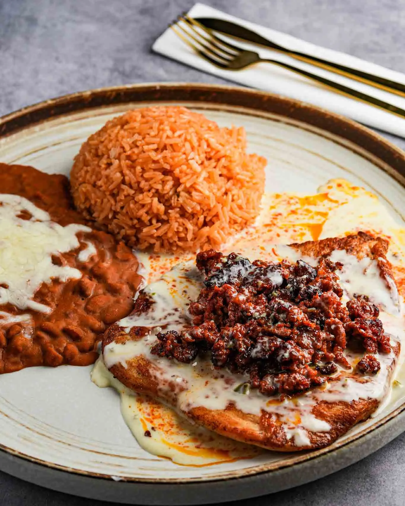 Chicken breast topped with Mexican chorizo and cheese sauce. Served with rice, and refried beans.