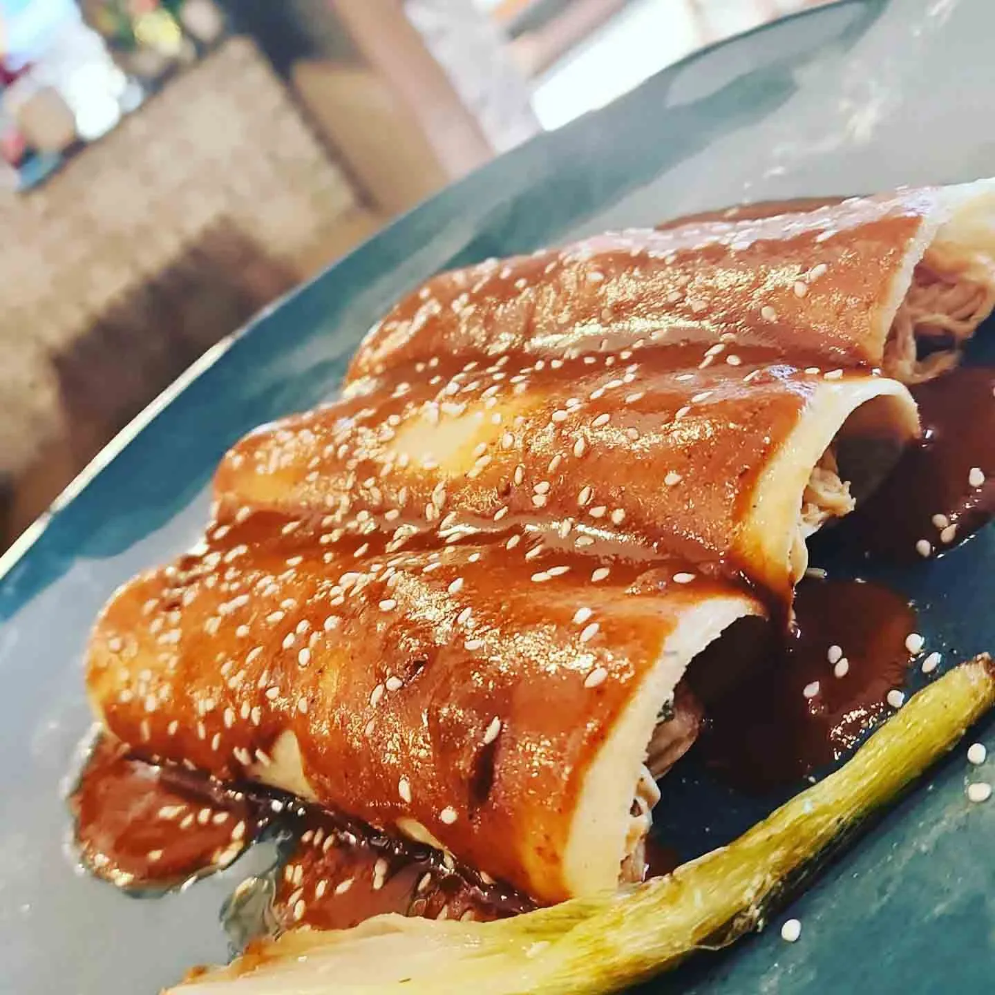 Strips of chicken topped with our delicious mole sauce. Served with rice, black beans or pinto beans and guacamole salad.