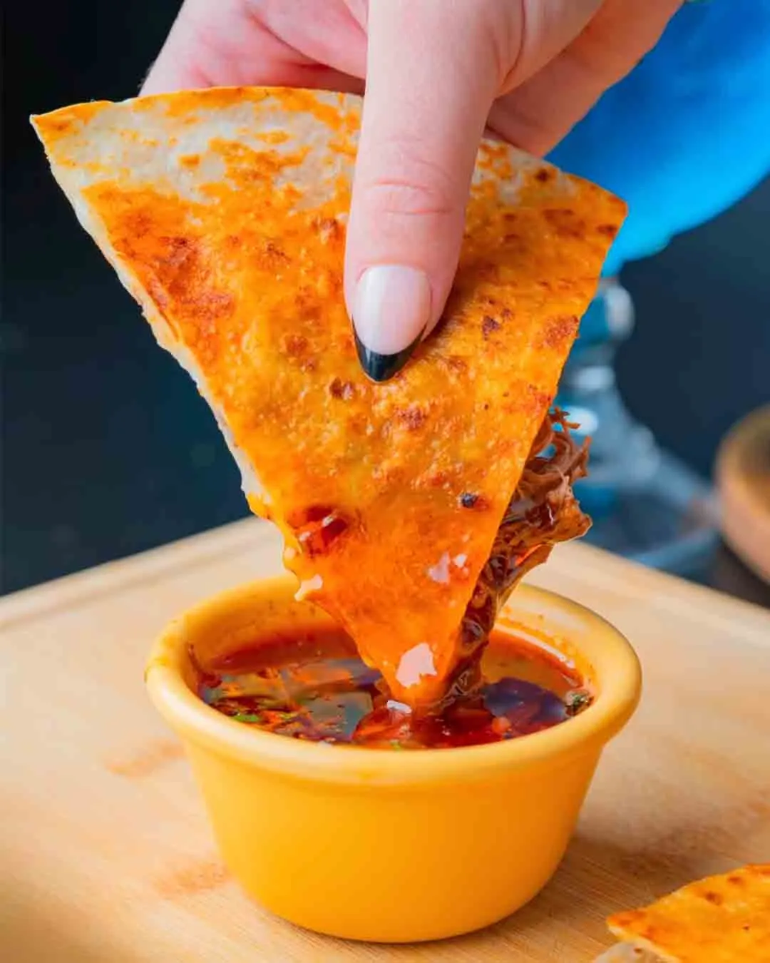 3 mini quesadillas filled with our birria special family recipe from Jalisco. Melted cheese, cilantro, radish, and onions. Birria consome on the side.