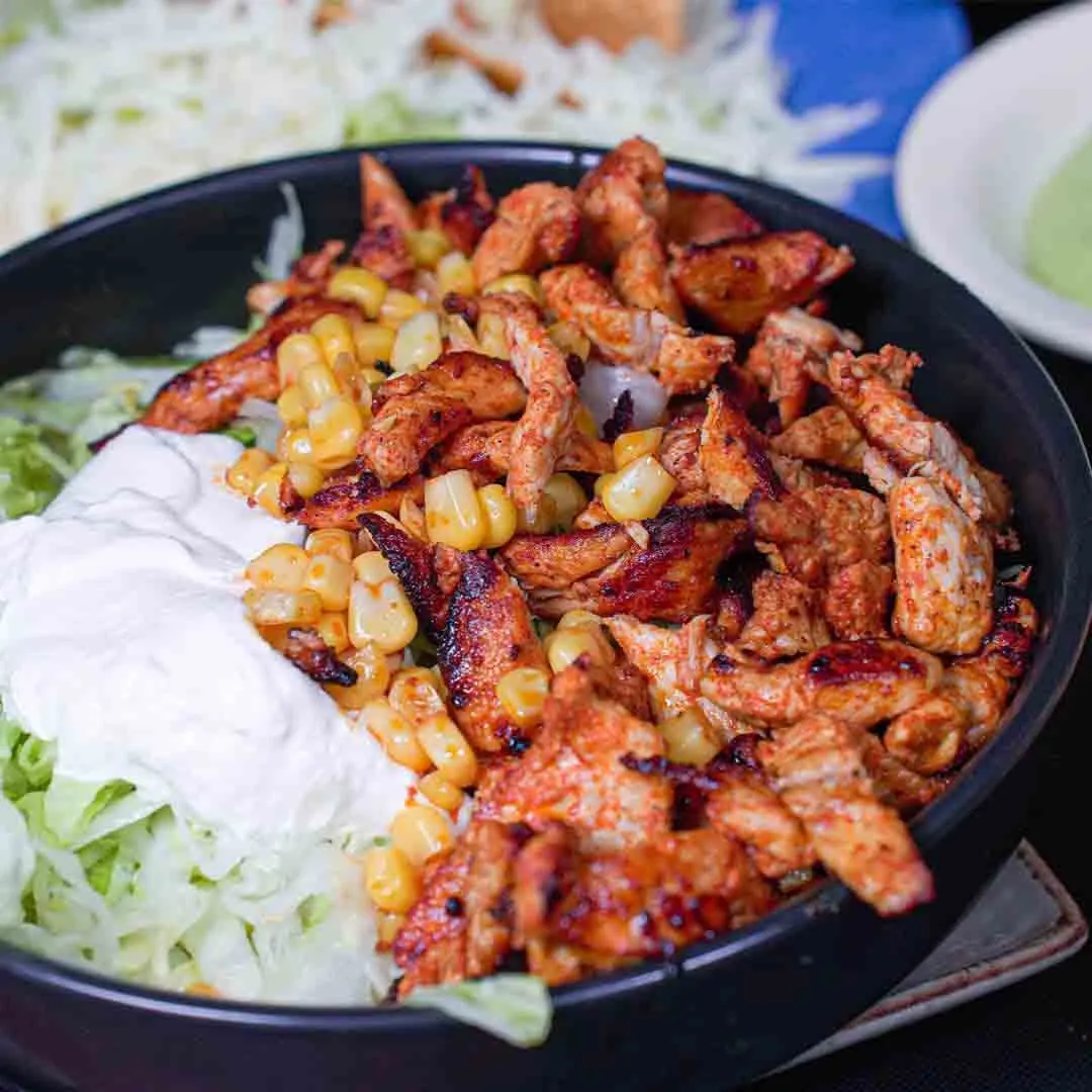 Grilled strips of chicken over a bed of Mexican rice, covered with melted cheese. Served with lettuce, sour cream, tomatoes and guacamole.