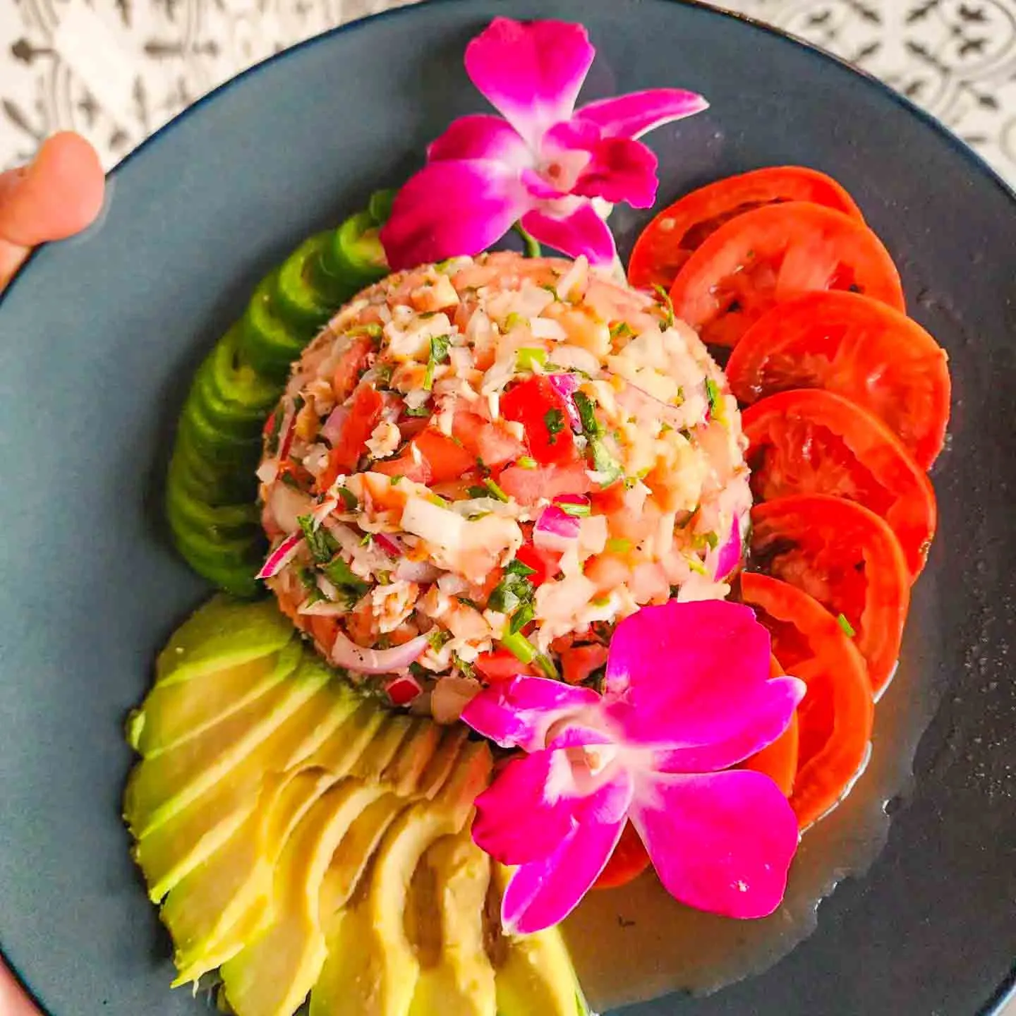 Fresh raw shrimp marinated with lime, red onions, tomatoes, cilantro and avocado.