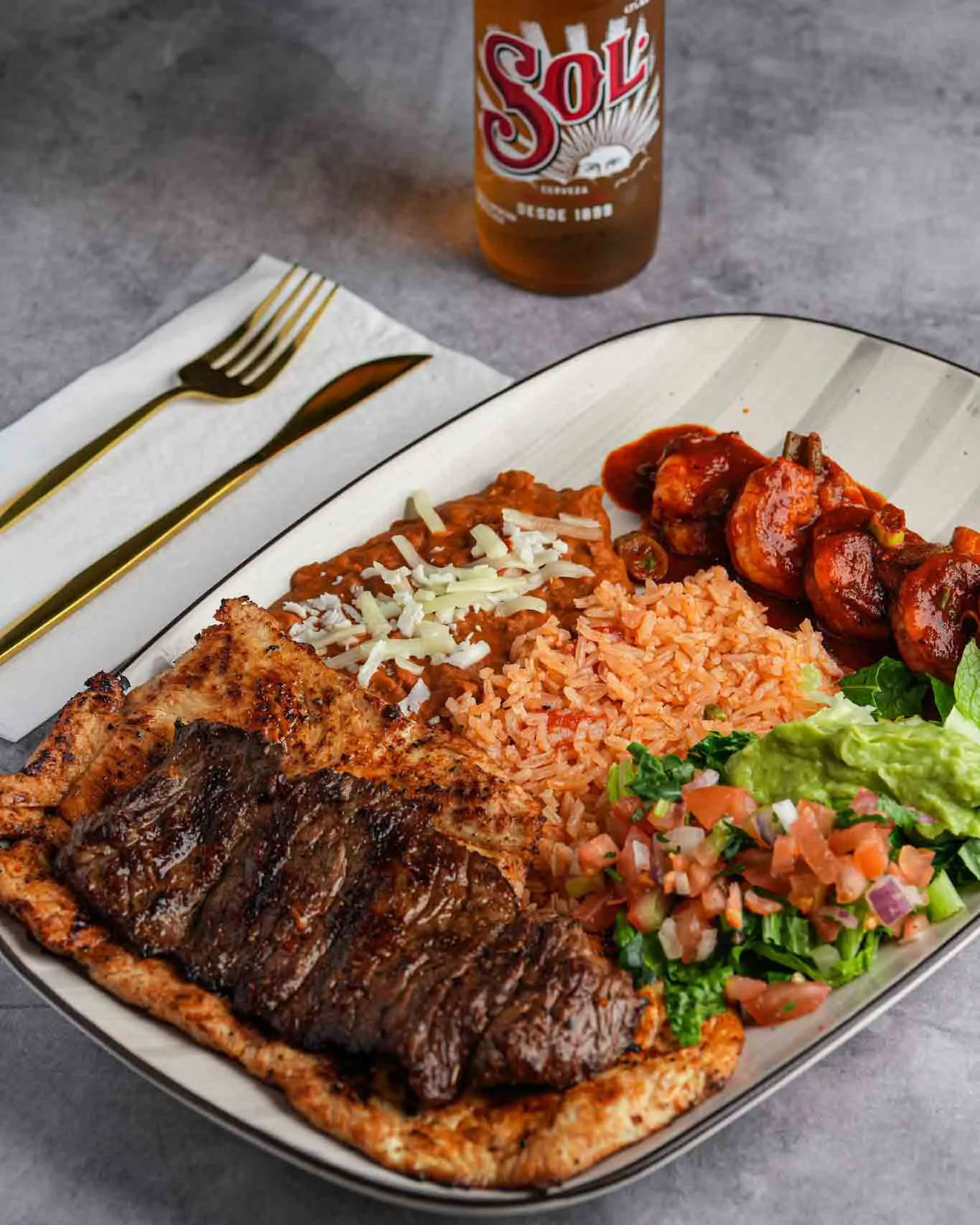 8oz Ribeye steak. Served with a cheese enchilada, grilled onions, rice, beans and guacamole salad.