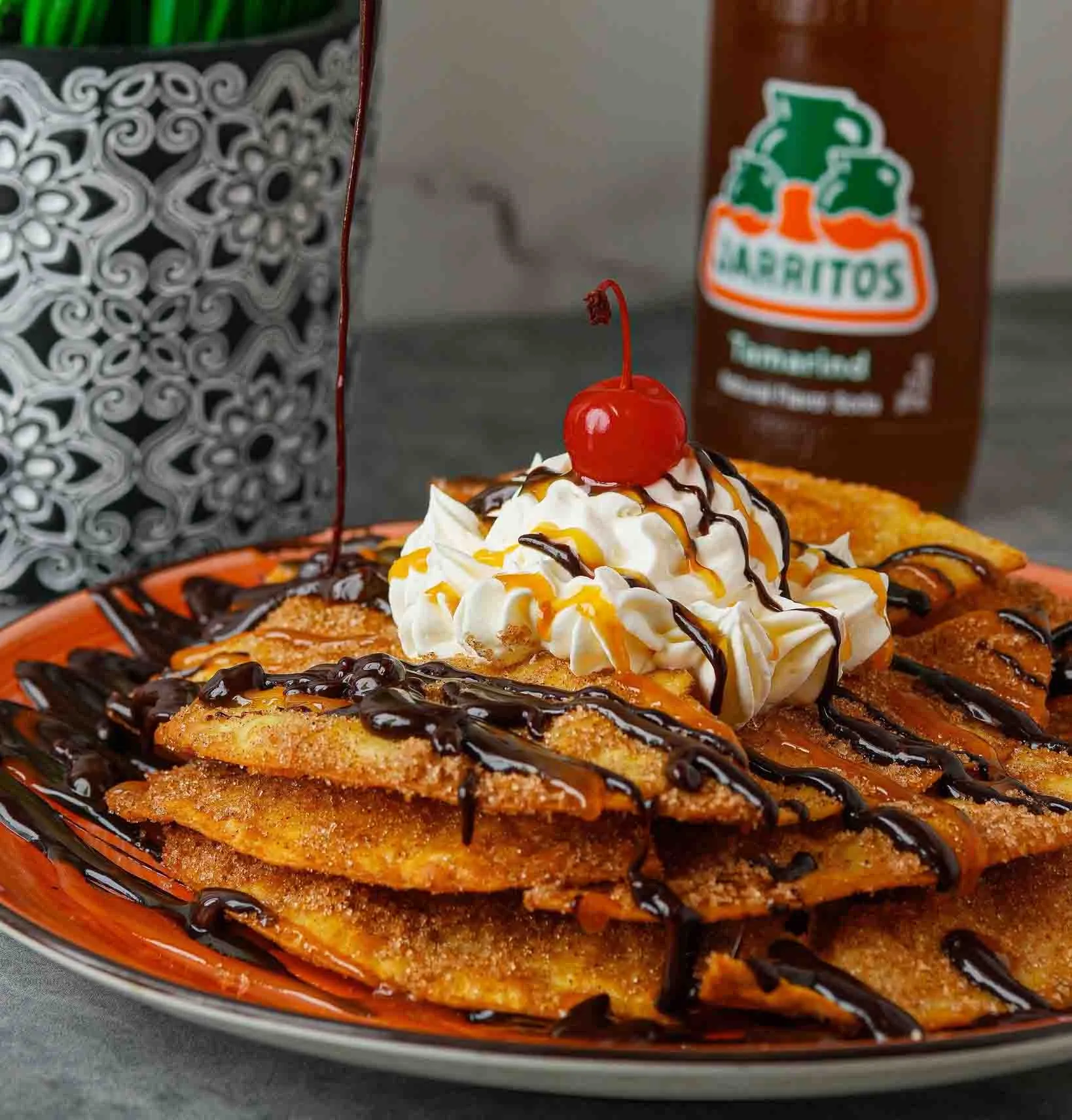 Deep-fried pastry. Served with red cabbage, roasted corn, sour cream, and pico de gallo.
