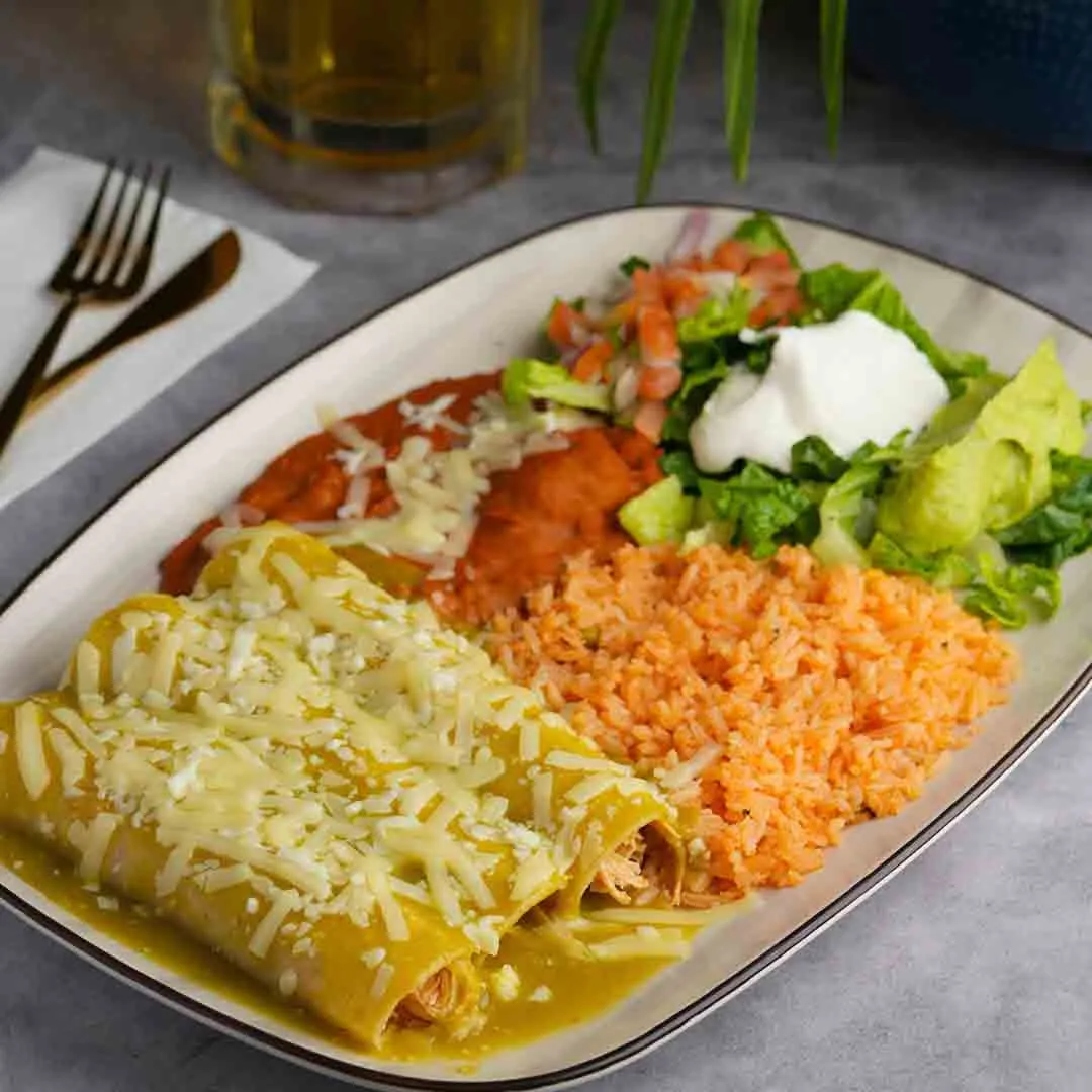 Chicken enchiladas topped with choice of Green Sauce, Mole Sauce, or Red Sauce. Served with rice, beans, and guacamole salad.