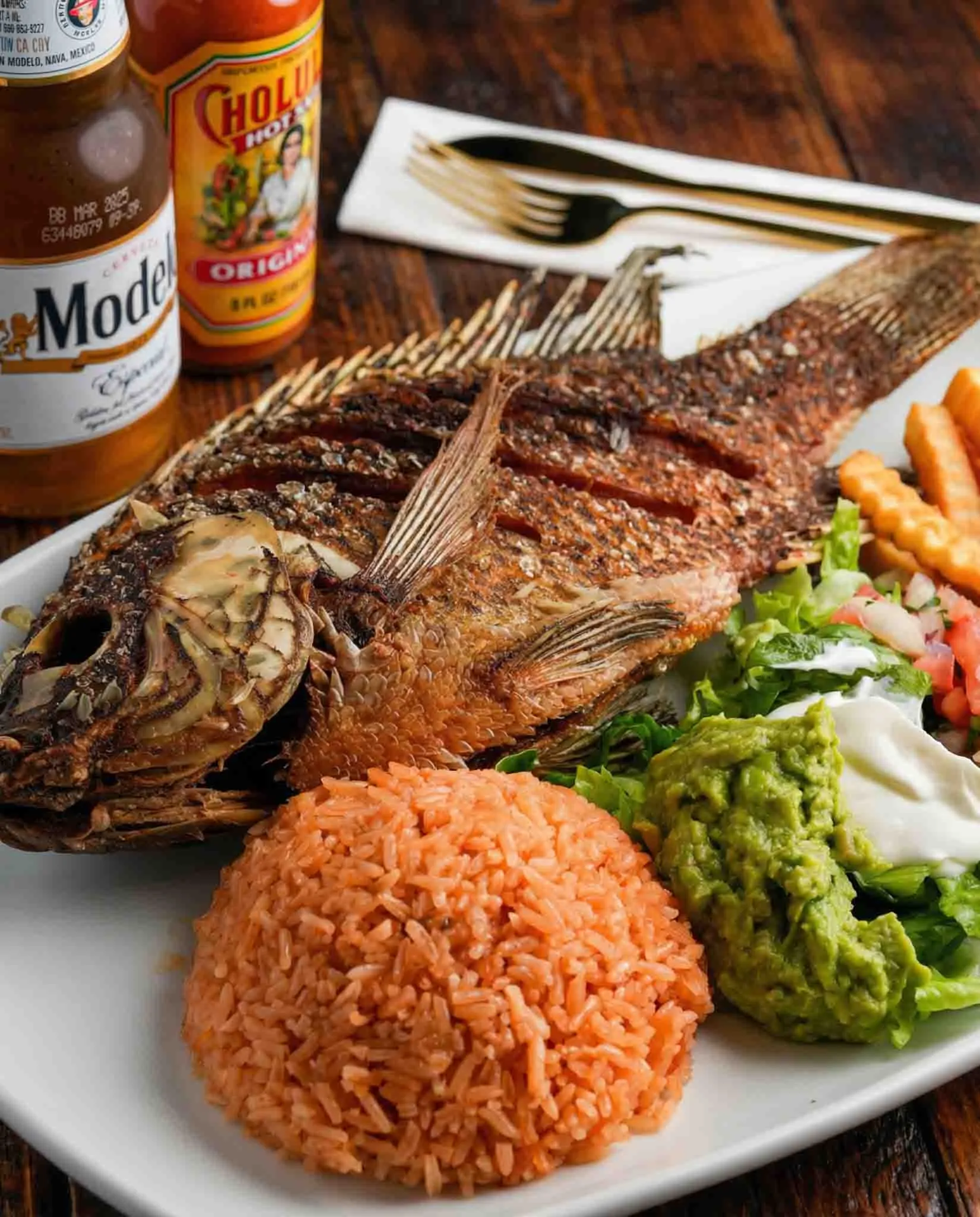 Whole deep fried tilapia. Served with rice, salad and french fries.