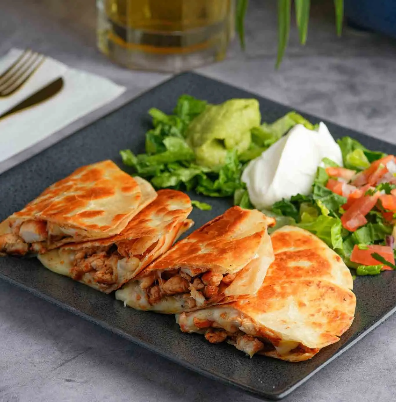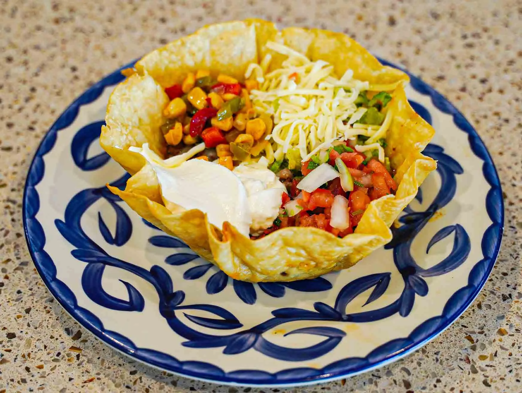 Crispy flour tortilla with lettuce, shredded cheese, guacamole, tomatoes and sour cream.
